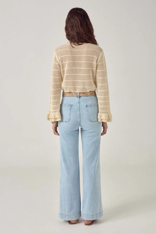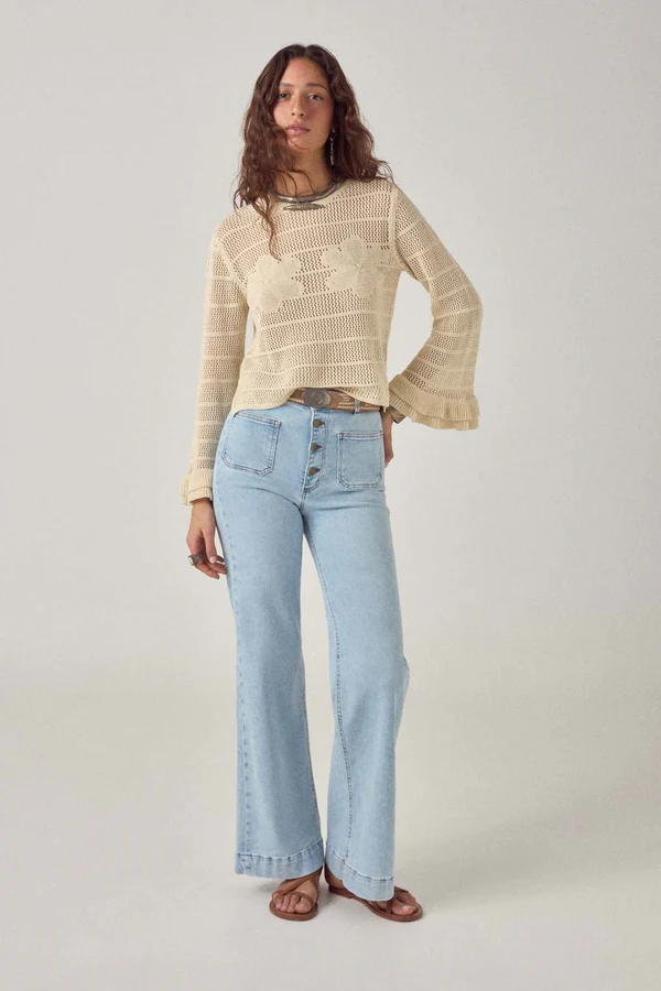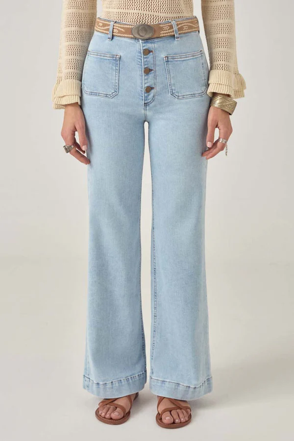 Taille mi-haute, coupe ajustée au niveau des hanches et jambe droite qui s’évase légèrement à l’ourlet. Fermeture à boutons : des boutons en métal massif qui lui confèrent un style rétro.