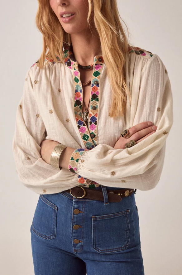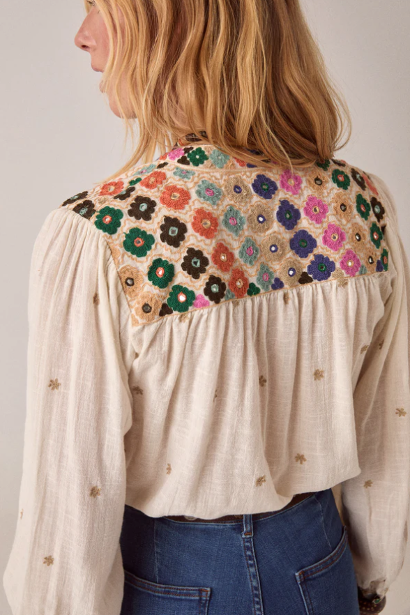 • Blouse à manches longues en gaze de coton flammé, ornée de broderies dispersées sur le devant. Broderies florales multicolores à l’encolure et sur la patte de boutonnage. Coupe ample et fluide. Fond blanc cassé.